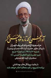 اعلام برنامه مراسم وداع مردم شریف تهران با پیکر مطهر حضرت آیت‌الله مصباح یزدی (قدس سره) شنبه ۹۹/۱۰/۱۳ ساعت ۹ صبح در حرم حضرت عبدالعظیم حسنی سخنران: آیت الله صدیقی با رعایت پروتکل‌های بهداشتی  ...