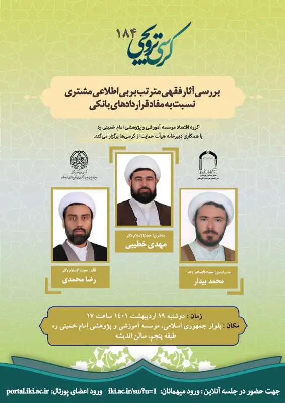 گروه علمی «اقتصاد» مؤسسه آموزشی و پژوهشی امام خمینی (ره) با همکاری دبیرخانه حمایت از کرسی‌ها برگزار می‌کند   موضوع: بررسی آثار فقهی مترتب بر بی‌اطلاعی مشتری نسبت به مفاد قراردادهای بانکی...
