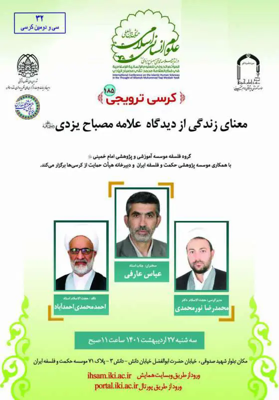 گروه علمی «فلسفه» مؤسسه آموزشی و پژوهشی امام خمینی (ره) با همکاری مؤسسه پژوهشی حکمت و فلسفه ایران و دبیرخانه حمایت از کرسی‌ها برگزار می‌کند   موضوع: معنای زندگی از دیدگاه علامه مصباح یزدی(ره...