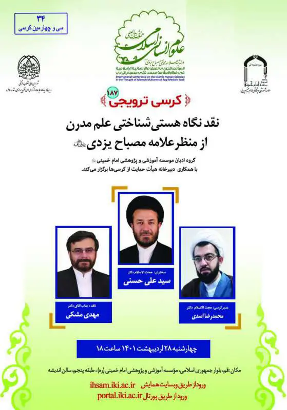 گروه علمی «ادیان» مؤسسه آموزشی و پژوهشی امام خمینی (ره) با همکاری دبیرخانه حمایت از کرسی‌ها برگزار می‌کند   موضوع: نقد نگاه هستی‌شناختی علم مدرن از منظر علامه مصباح یزدی (ره)   ارائه‌...