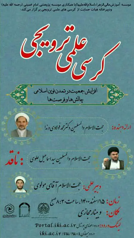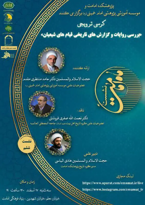 پژوهشکده امامت و مؤسسه آموزشی و پژوهشی امام خمینی (ره) برگزار می‌کند یکصد و هفتاد و هشتمین کرسی علمی ترویجی مؤسسه آموزشی و پژوهشی امام خمینی(ره) موضوع: بررسی روایات و گزارش‌های تاریخی قیام‌های...