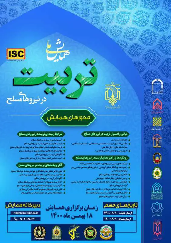 دانشكده عقیدتی سیاسی شهید محلاتی با همكاری مراكز علمی از جمله مؤسسه آموزشی و پژوهشی امام خمینی(ره) برگزار می‌كند  همایش ملی تربیت در نیروهای مسلح  محورهای همایش...