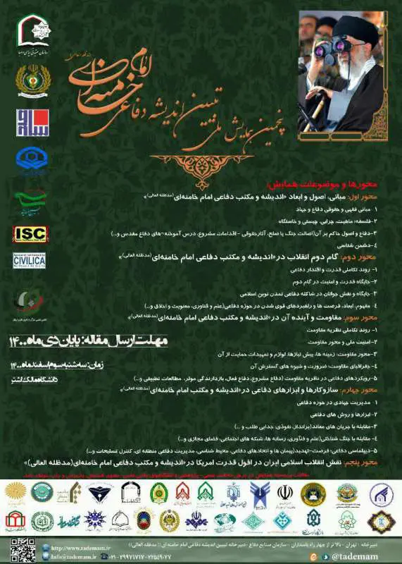 برگزاری پنجمین همایش ملی تبیین اندیشه دفاعی امام خامنه‌ای (مدظله العالی) با همكاری مؤسسه آموزشی و پژوهشی امام خمینی(ره) محورها و موضوعات همایش: محور اول: مبانی، اصول و ابعاد «اندیشه و...