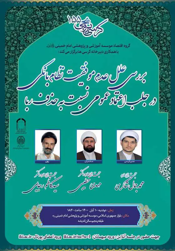 گروه اقتصاد مؤسسه آموزشی و پژوهشی امام خمینی (ره) با همکاری دبیرخانه کرسی‌ها برگزار می‌کند موضوع: بررسی علل عدم موفقیت نظام بانکی در جلب اعتماد عمومی نسبت به حذف ربا   ارائه‌کننده: حجت...