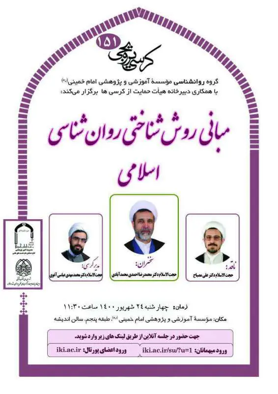 گروه روان‌شناسی مؤسسه آموزشی و پژوهشی امام خمینی (ره) برگزار می‌کند موضوع: مبانی روش‌شناختی روان‌شناسی اسلامی   ارائه‌کننده: حجت الاسلام و المسلمین آقای دكتر محمدرضا...