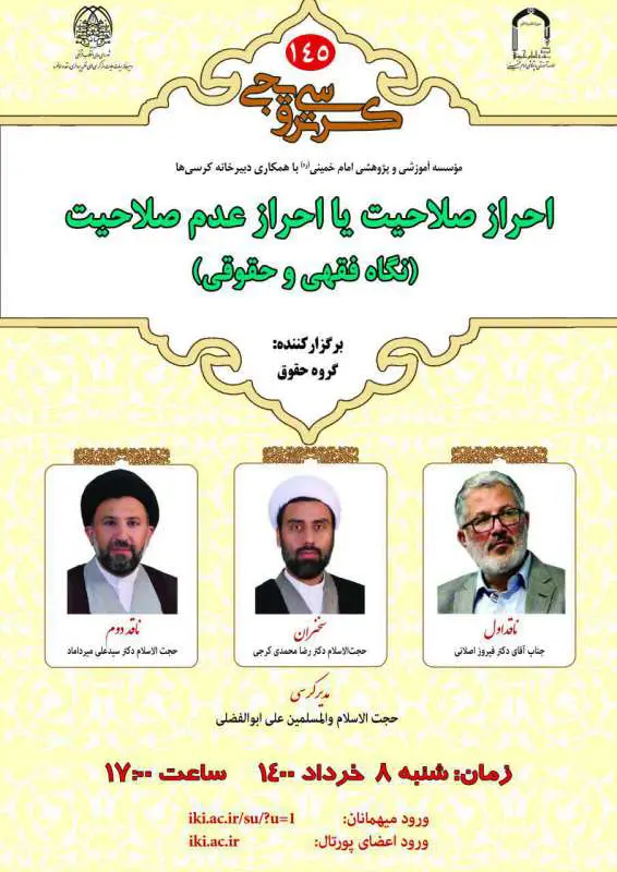 گروه حقوق مؤسسه آموزشی و پژوهشی امام خمینی (ره) با همکاری مرکز فقهی ائمه اطهار (علیهم‌السلام) و دبیرخانه کرسی‌ها برگزار می‌کند   موضوع: احراز صلاحیت یا احراز عدم صلاحیت (نگاه فقهی و حقوقي...