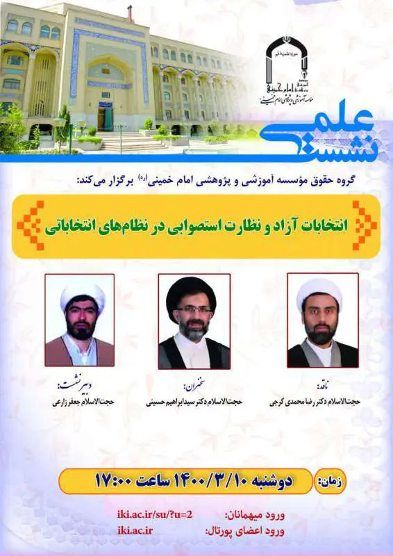 گروه حقوق مؤسسه آموزشی و پژوهشی امام خمینی (ره) برگزار می‌کند   موضوع: انتخابات آزاد و نظارت استصوابي در نظام‌هاي انتخاباتي   ارائه‌کننده: حجت الاسلام و المسلمین آقای دکتر سيد ابراهيم...