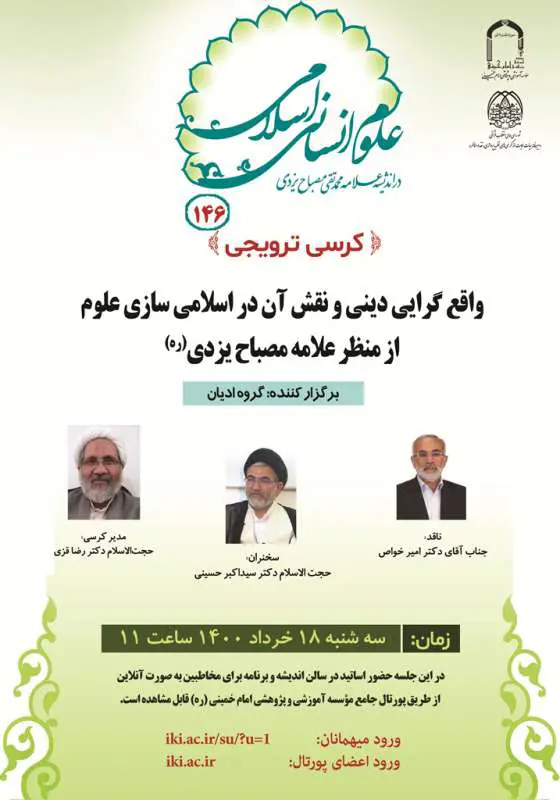 گروه علمي اديان مؤسسه آموزشی و پژوهشی امام خمینی (ره) با همکاری دبیرخانه کرسی‌ها برگزار می‌کند   موضوع: واقع‌گرايي ديني و نقش آن در اسلامي سازي علوم از منظر علامه مصباح یزدی(ره)...