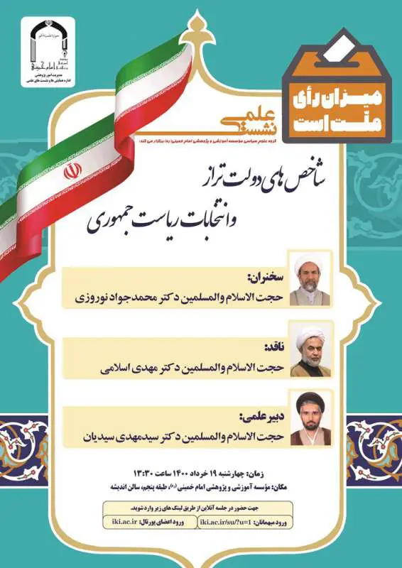 گروه علوم سیاسی مؤسسه آموزشی و پژوهشی امام خمینی (ره) برگزار می‌کند   موضوع: شاخص‌های دولت تراز و انتخابات ریاست جمهوری   ارائه‌کننده: حجت الاسلام و المسلمین آقای دکتر...