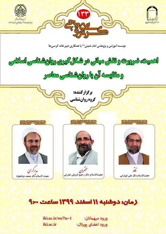 گروه روان‌شناسی مؤسسه آموزشی و پژوهشی امام خمینی (ره) با همکاري دبیرخانه کرسی‌ها برگزار می‌کند: كرسی ترویجی اهمیت، ضرورت و نقش مبانی در شکل‌گیری روان‌شناسی اسلامی و...
