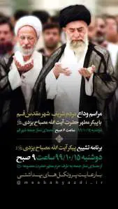 زبان فارسی مراسم وداع مردم شریف شهر مقدس قم با پیکر مطهر حضرت آیت الله مصباح یزدی (قدس سره) ▫ دوشنبه ۹۹/۱۰/۱۵ ساعت ۶ صبح مصلای نماز جمعه ▫ با رعایت پروتکل‌های بهداشتی...