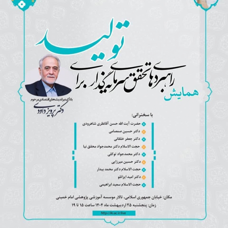 همایش راهبردهای تحقق سرمایه گذاری برای تولید  «با تاکید بر اندیشه های اقتصادی مرحوم دکتر داودی»   سخنرانان:    آیت‌الله حسن آقانظری شاهرودی دکتر حسین...