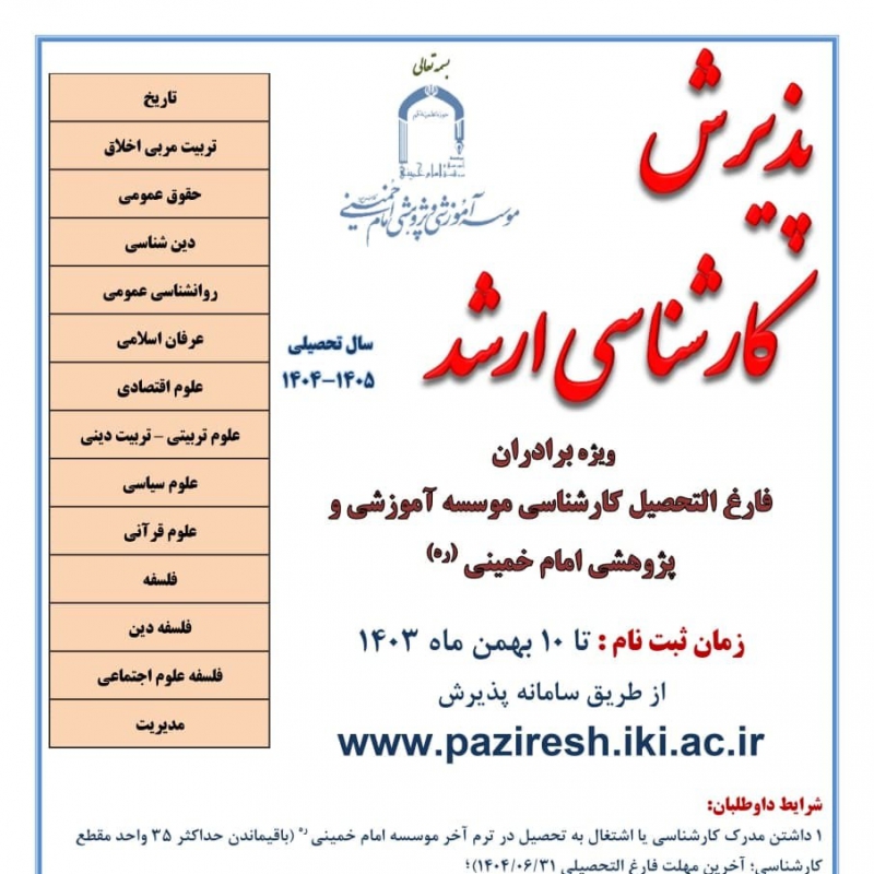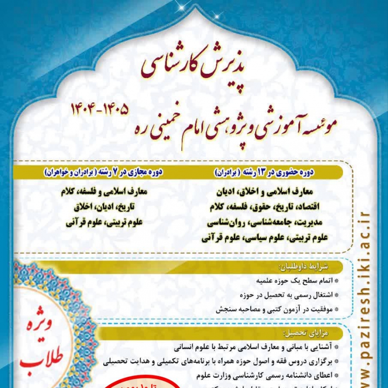 پذیرش كارشناسی‌ارشد (حضوری ویژه برادران)  سال تحصیلی ۱۴۰۵ -۱۴۰۴    ويژه دانش آموختگان كارشناسی موسسه آموزشی و پژوهشی امام خمینی ره  شرایط داوطلبان...