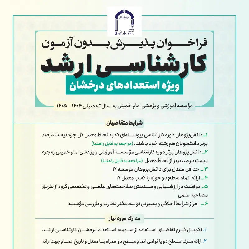 فراخوان پذیرش بدون آزمون کارشناسی ارشد ویژه استعدادهای درخشان مؤسسه آموزشی و پژوهشی امام خمینی ره سال تحصیلی ۱۴۰۴ - ۱۴۰۵  شرایط متقاضیان ۱ـ دانش‌پژوهان دوره کارشناسی...