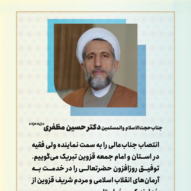 پیام تبریک انتصاب حجت‌الاسلام دکتر حسین مظفری به سمت نماینده ولی فقیه و امامت جمعه استان قزوین