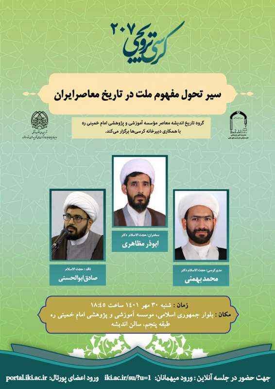 گروه علمی «تاریخ اندیشه معاصر» مؤسسه آموزشی و پژوهشی امام خمینی (ره) با همکاری دبیرخانه هیئت حمایت از کرسی‌ها برگزار می‌کند موضوع: سیر تحول مفهوم ملت در تاریخ معاصر ایران ارائه‌کننده: حجت الاسلام...