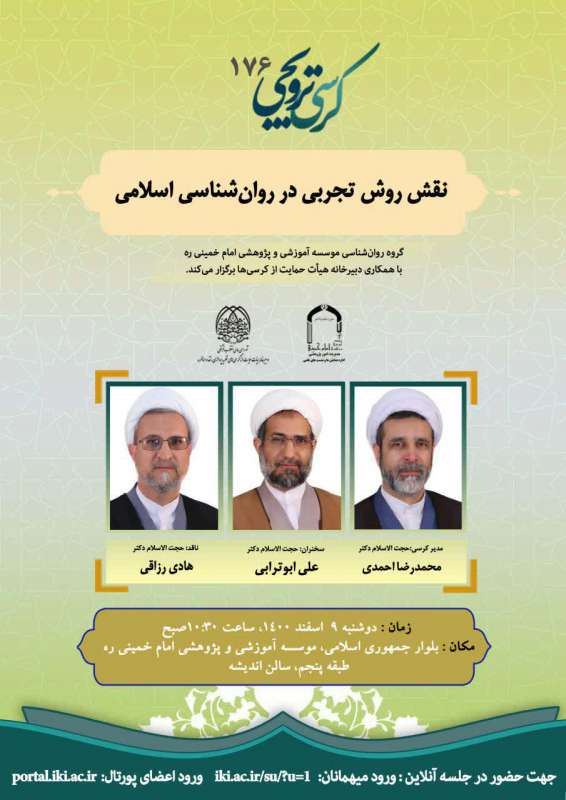 گروه روان‌شناسی مؤسسه آموزشی و پژوهشی امام خمینی (ره) با همکاری دبیرخانه حمایت از کرسی‌ها برگزار می‌کند   موضوع: نقش روش تجربی در روان‌شناسی اسلامی   ارائه‌کننده: حجت الاسلام و...