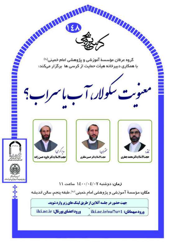گروه عرفان مؤسسه آموزشی و پژوهشی امام خمینی (ره) برگزار می‌کند   موضوع: معنويت سكولار، آب يا سراب؟   ارائه‌کننده: حجت الاسلام و المسلمین آقای دکتر حسين مظفري...