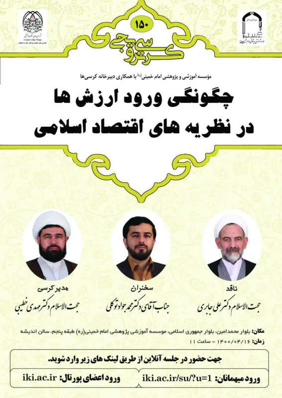 گروه اقتصاد مؤسسه آموزشی و پژوهشی امام خمینی (ره) برگزار می‌کند موضوع: چگونگی ورود ارزش‌ها در نظریه‌های اقتصاد اسلامی   ارائه‌کننده: جناب آقای دكتر محمدجواد توكلی ناقد: حجت الاسلام و...