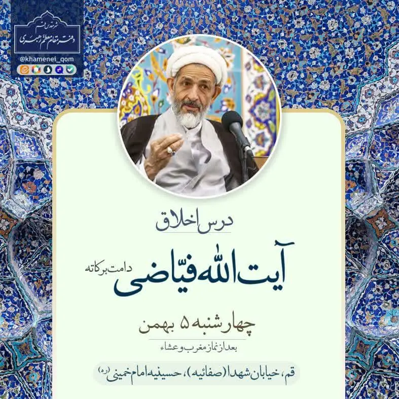 درس اخلاق آیت الله فیاضی (دامت برکاته) در دفتر مقام معظم رهبری (مدظله‌العالی) - قم   چهارشنبه ١۴٠١/۱۱/۵، بعد از نماز مغرب و عشا  قم، خیابان شهدا (صفائيه)، حسینیه امام خمینی (رحمة الله...
