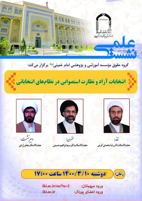 گروه حقوق مؤسسه آموزشی و پژوهشی امام خمینی (ره) برگزار می‌کند   موضوع: انتخابات آزاد و نظارت استصوابي در نظام‌هاي انتخاباتي   ارائه‌کننده: حجت الاسلام و المسلمین آقای دکتر سيد ابراهيم...