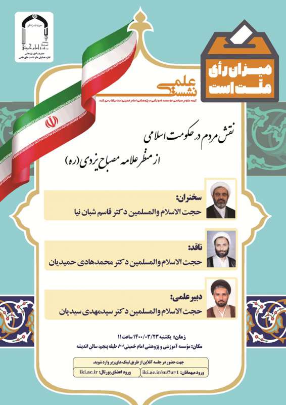 گروه علوم سیاسی مؤسسه آموزشی و پژوهشی امام خمینی (ره) برگزار می‌کند   موضوع: نقش مردم در حكومت اسلامي از منظر علامه مصباح يزدي(ره)   ارائه‌کننده: حجت الاسلام و المسلمین آقای دکتر قاسم...
