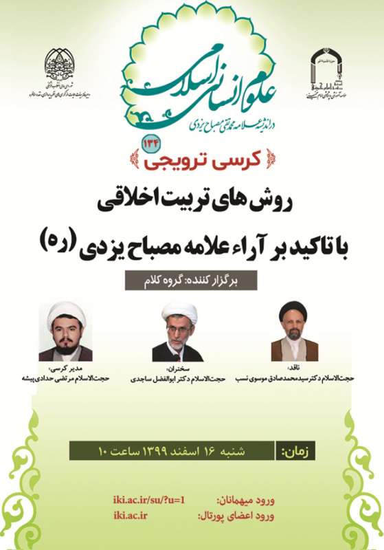 کرسی علمی ترویجی 134 گروه كلام مؤسسه آموزشی و پژوهشی امام خمینی (ره) برگزار می‌کند    روش‌هاي تربيت اخلاقي با تأكيد بر آراء علامه مصباح يزدي(ره)   ارائه‌کننده: حجت...