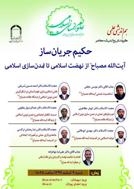 گروه تاریخ اندیشه معاصر مؤسسه آموزشی و پژوهشی امام خمینی(ره) برگزار می‌کند هم‌اندیشی علمی حکیم جریان‌ساز آیت‌الله مصباح (ره) از نهضت اسلامی تا تمدن‌سازی اسلامی   سخنرانان...