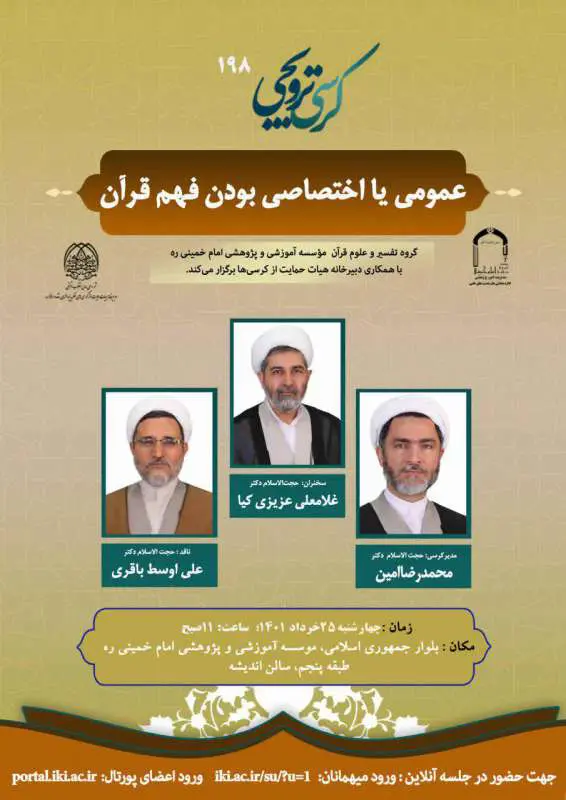 گروه تفسیر و علوم قرآن با همکاری دبیرخانه حمایت از کرسی‌ها برگزار می‌کند   موضوع: عمومی یا اختصاصی بودن فهم قرآن   ارائه‌کننده: حجت الاسلام و المسلمین آقای دکتر غلامعلی عزیزی‌کیا...