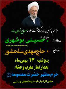 با تشکر از همه عزیزانی که با حضور در مراسم تشییع و ختم حضرت علامه مصباح یزدی(رضوان الله تعالی علیه) و یا با صدور پیامهای تسلیت، با خاندان معظم ایشان اظهار محبت و همدردی نمودند، به اطلاع میرساند مراسم چهلمین روز درگذشت آن سالک طریق معرفت توحیدی- با رعایت شیوه نامههای بهداشتی - برگزار میگردد.