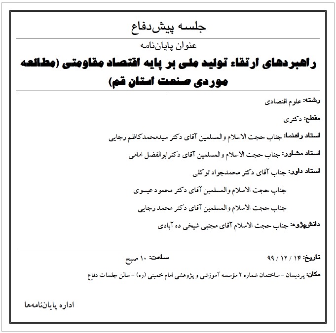 مکان: پرديسان - ساختمان شماره 2 مؤسسه آموزشي و پژوهشي امام خميني (ره) - سالن جلسات دفاع