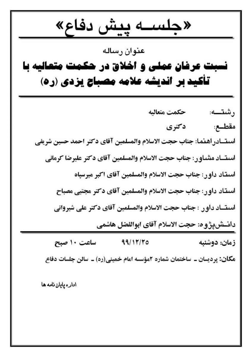 جلسه پیش دفاع پایان‌نامه دانش‌پژوهان مؤسسه آموزشي و پژوهشي امام خميني(ره)