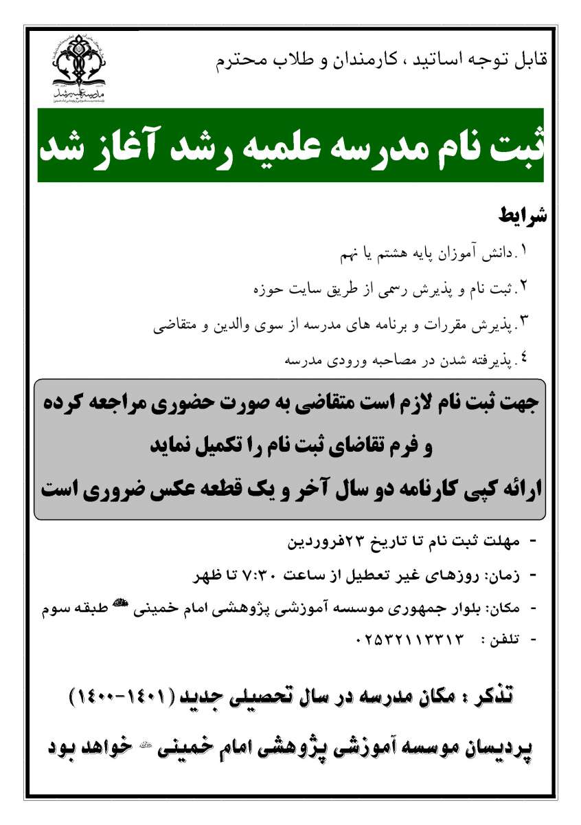 آغاز ثبت نام مدرسه علمیه رشد وابسته به مؤسسه آموزشی و پژوهشی امام خمینی(ره)