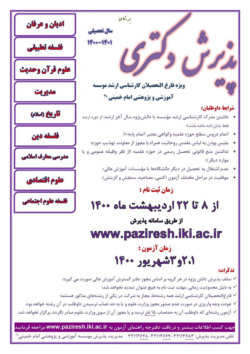 پذیرش دوره دکتری سال تحصیلی 1401-1400 ویژه فارغ التحصیلان کارشناسی ارشد مؤسسه آموزشی و پژوهشی امام خمینی(ره)
