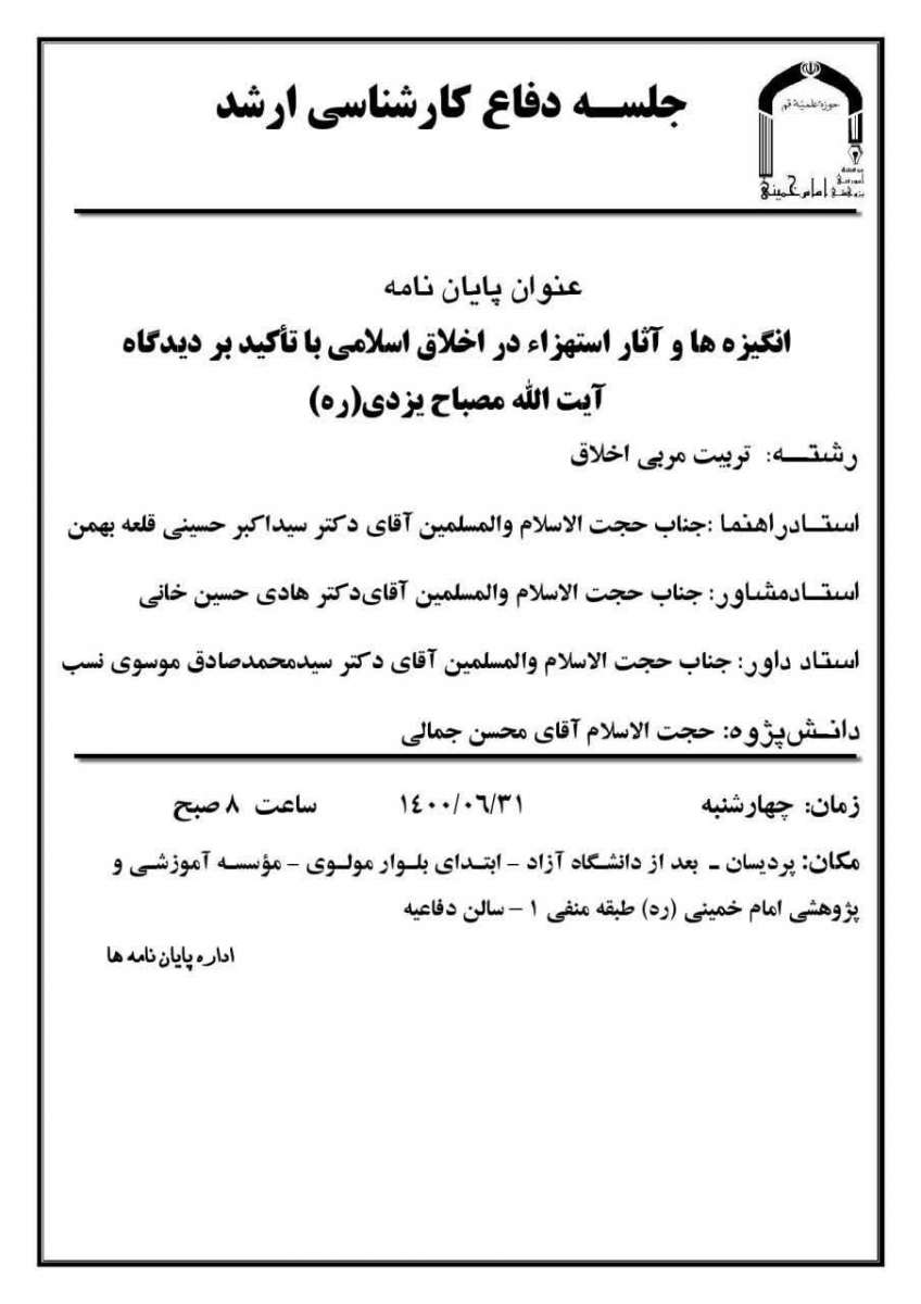 جلسه دفاع پایان‌نامه کارشناسی ارشد دانش‌پژوهان مؤسسه آموزشی و پژوهشی امام خمینی(ره)