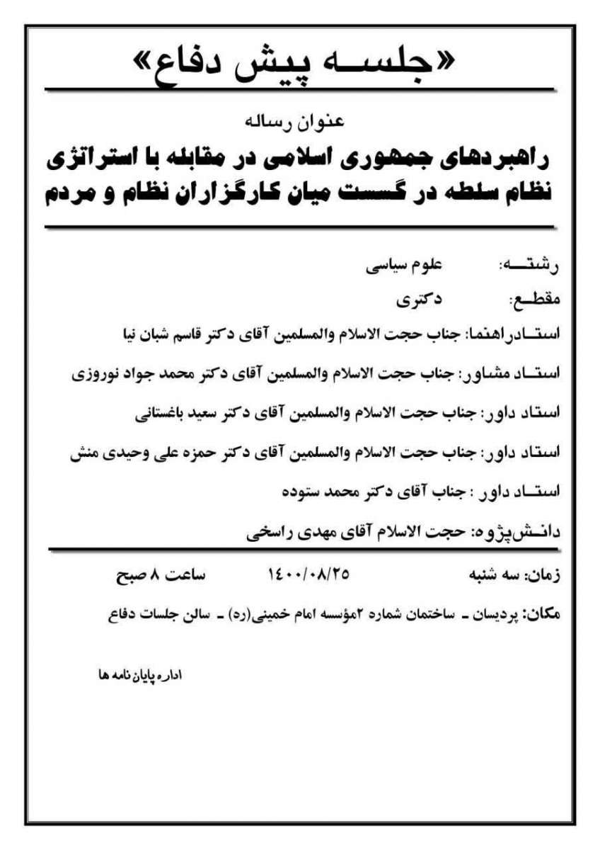 جلسه پیش‌دفاع رساله دكتری دانش‌پژوهان مؤسسه آموزشی و پژوهشی امام خمینی(ره)