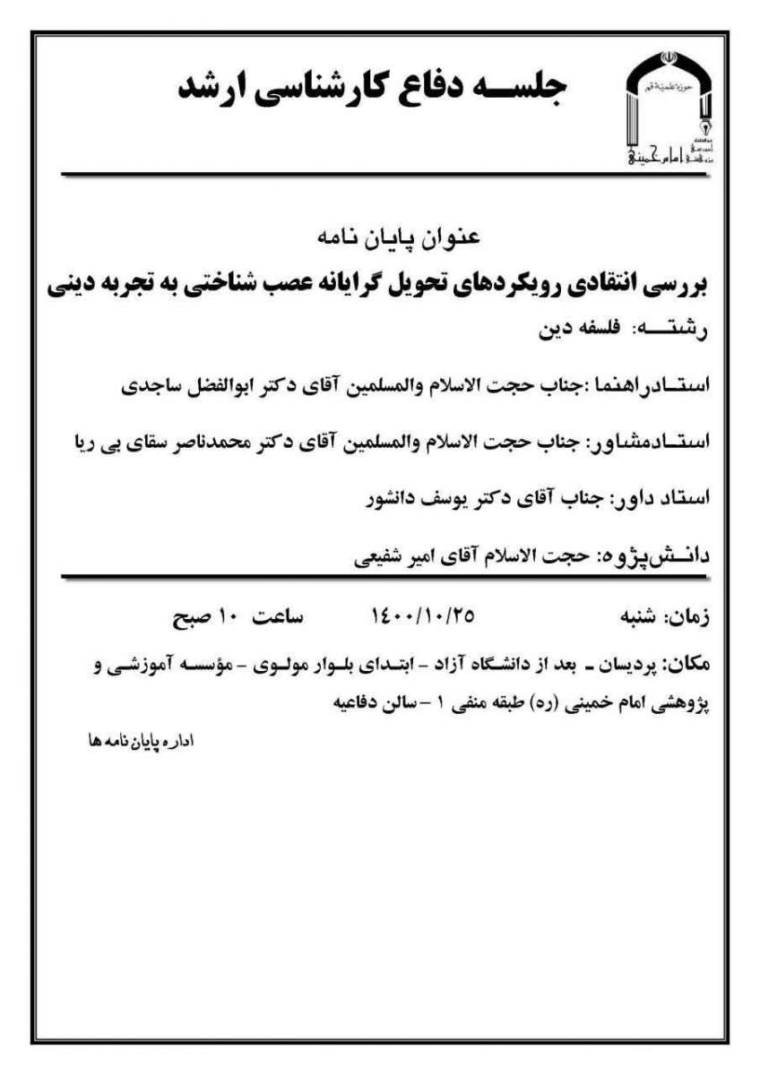 جلسه دفاع پایان‌نامه دانش‌پژوهان مؤسسه آموزشی و پژوهشی امام خمينی(ره)