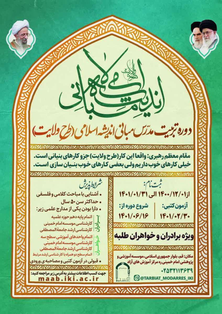 مرکز آموزشهای آزاد، موسسه آموزشی و پژوهشی امام خمینی(ره) در راستای عمل به فرمایشات مقام معظم رهبری مبنی بر ضرورت فراگیر شدن طرح ولایت و به منظور تکمیل کادر اساتید طرح ولایت، برای پانزدهمین دوره تربیت مدرس مبانی اندیشه اسلامی(طرح ولایت) از میان طلاب فاضل پذیرش می نماید.