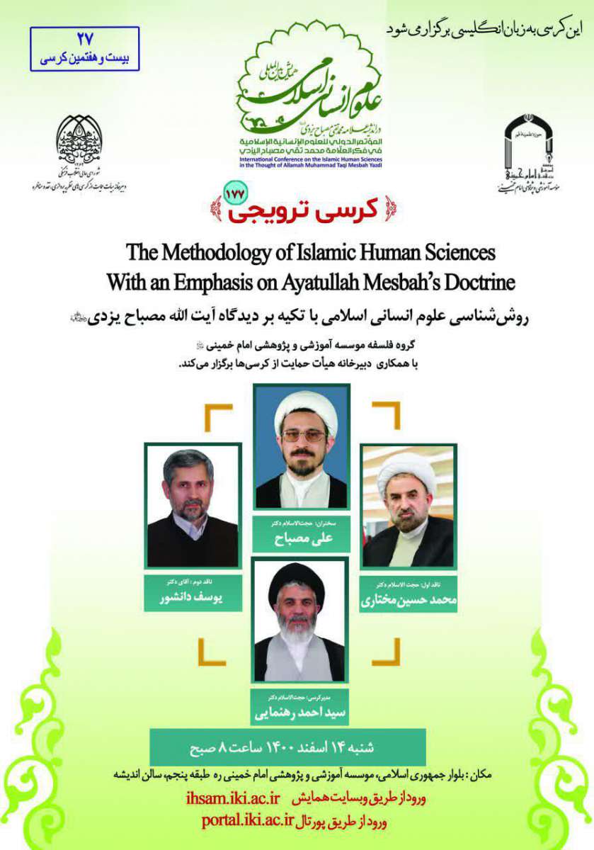 گروه علمی «فلسفه» مؤسسه آموزشی و پژوهشی امام خمینی (ره) با همکاری همایش بینالمللی علوم انسانی اسلامی در اندیشه علامه مصلاح یزدی(ره) و دبیرخانه حمایت از کرسیها برگزار میکند