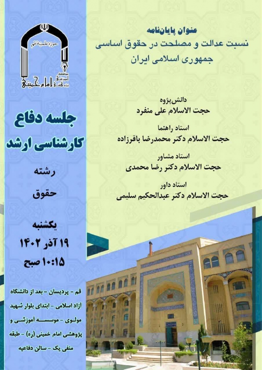 جلسه دفاع پایان‌نامه با موضوع نسبت عدالت و مصلحت در حقوق اساسی جمهوری اسلامی ایران