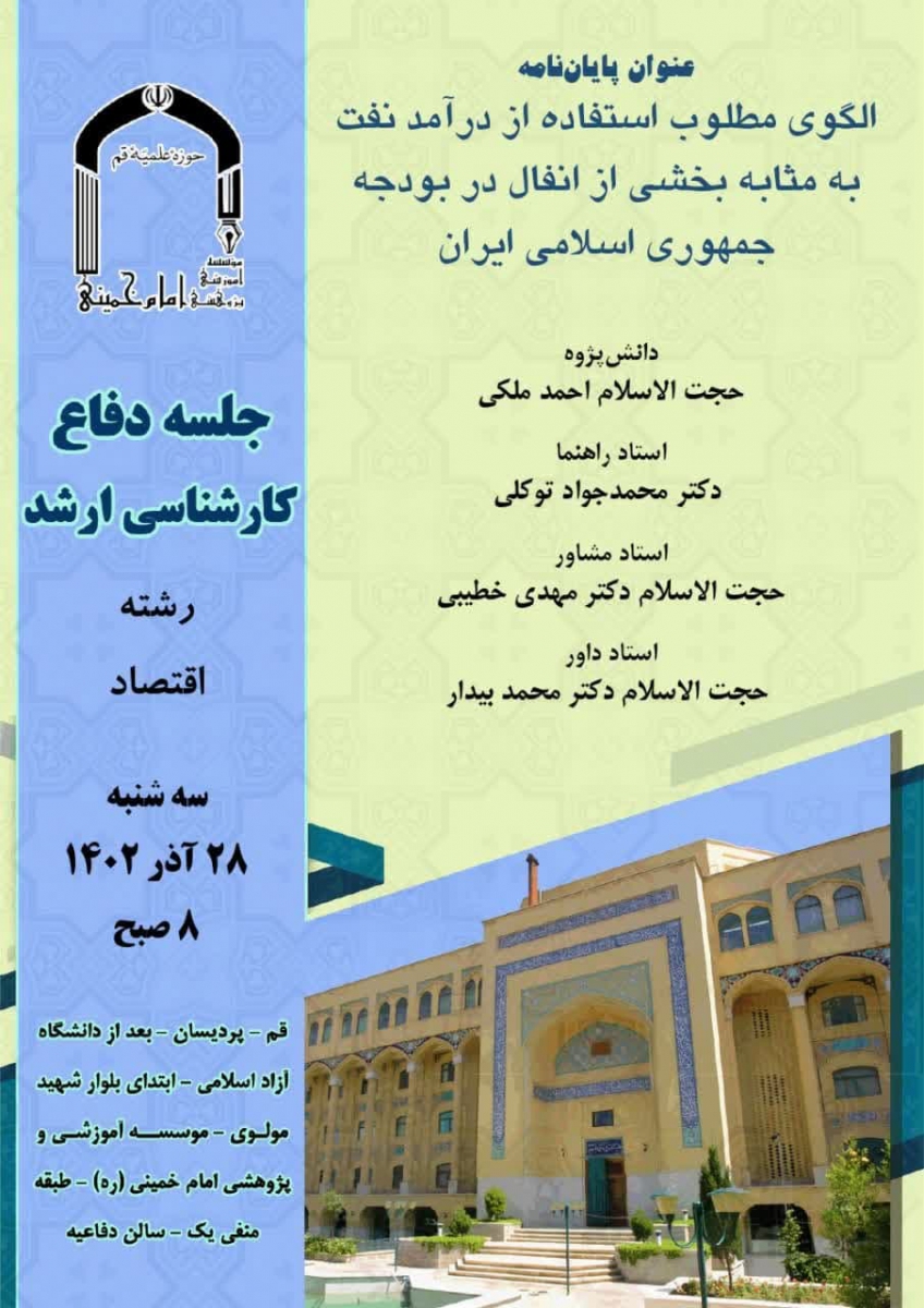 جلسه دفاع پایان‌نامه با موضوع الگوی مطلوب استفاده از درآمد نفت به مثابه بخشی از انفال در بوجه جمهوری اسلامی ایران