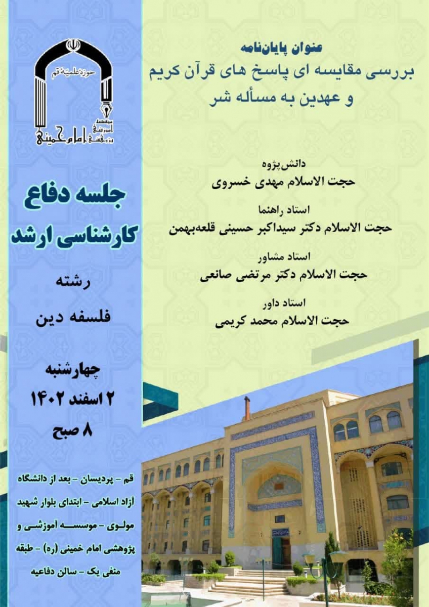 جلسه دفاع پایان نامه با موضوع بررسی مقایسه‌ای پاسخ‌های قرآن کریم و عهدین به مسئله شر