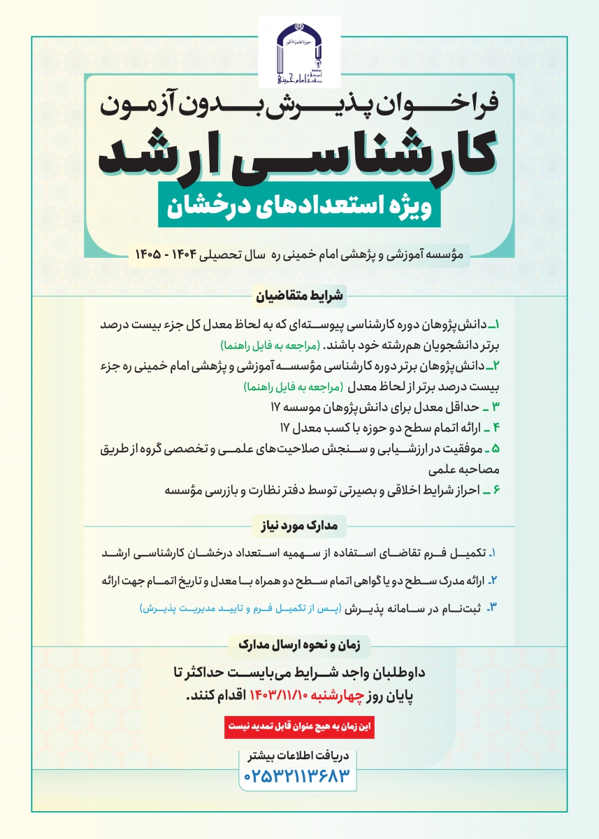 فراخوان پذیرش بدون آزمون کارشناسی ارشد ویژه استعدادهای درخشان مؤسسه آموزشی و پژوهشی امام خمینی ره سال تحصیلی ۱۴۰۴ - ۱۴۰۵