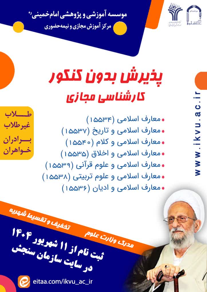 اعلام شرایط و چگونگی ثبتنام کارشناسی پیوسته (مجازی) ۱۴۰۴ مرکز آموزش عالی فرهنگ و معارف اسلامی وابسته به مؤسسه آموزشی و پژوهشی امام خمینی (ره) پذیرش صرفاً بر اساس سوابق تحصیلی (معدل دیپلم) ثبتنام و انتخاب رشته: ۱۴۰۴/۰۶/۱۱ در سایت سازمان سنجش |