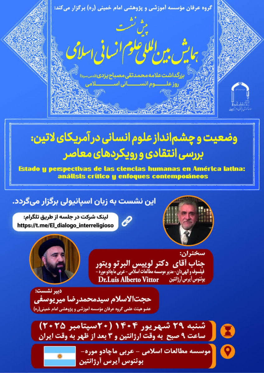 گروه عرفان مؤسسه آموزشی و پژوهشی امام خمینی ره برگزار میکند: پیشنشست همایش بینالمللی علوم انسانی اسلامی روز بزرگداشت علامه محمدتقی مصباح یزدی (قدس سره) | روز علوم انسانی اسلامی عنوان «وضعیت و چشمانداز علوم انسانی در آمریکای لاتین: بررسی انتقادی و رویکردهای معاصر» Estado y perspective de las ciencias humanas en America latina: analisis cruico y enfoques contemporaneos سخنران جناب آقای دکتر لوئیس البرتو ویتور Dr. Luis Alberto Vittor فیلسوف و الهیدان- مدیر مؤسسه مطالعات اسلامی - عربی ماچادو موره - بوئنوس آیرس آرژانتین دبیر نشست حجتالاسلام سیدمحمدرضا میریوسفی عضو هیئت علمی گروه عرفان مؤسسه آموزشی و پژوهشی امام خمینی ره لینک شرکت در جلسه از طریق تلگرام شنبه ۲۹ شهریورماه ۱۴۰۴ (۲۰ سپتامبر ۲۰۲۵) | ساعت ۹ صبح به وقت آرژانتین (۳ بعدازظهر به وقت ایران) مؤسسه مطالعات اسلامی - عربی ماچادو موره - بوئنوس آیرس آرژانتین