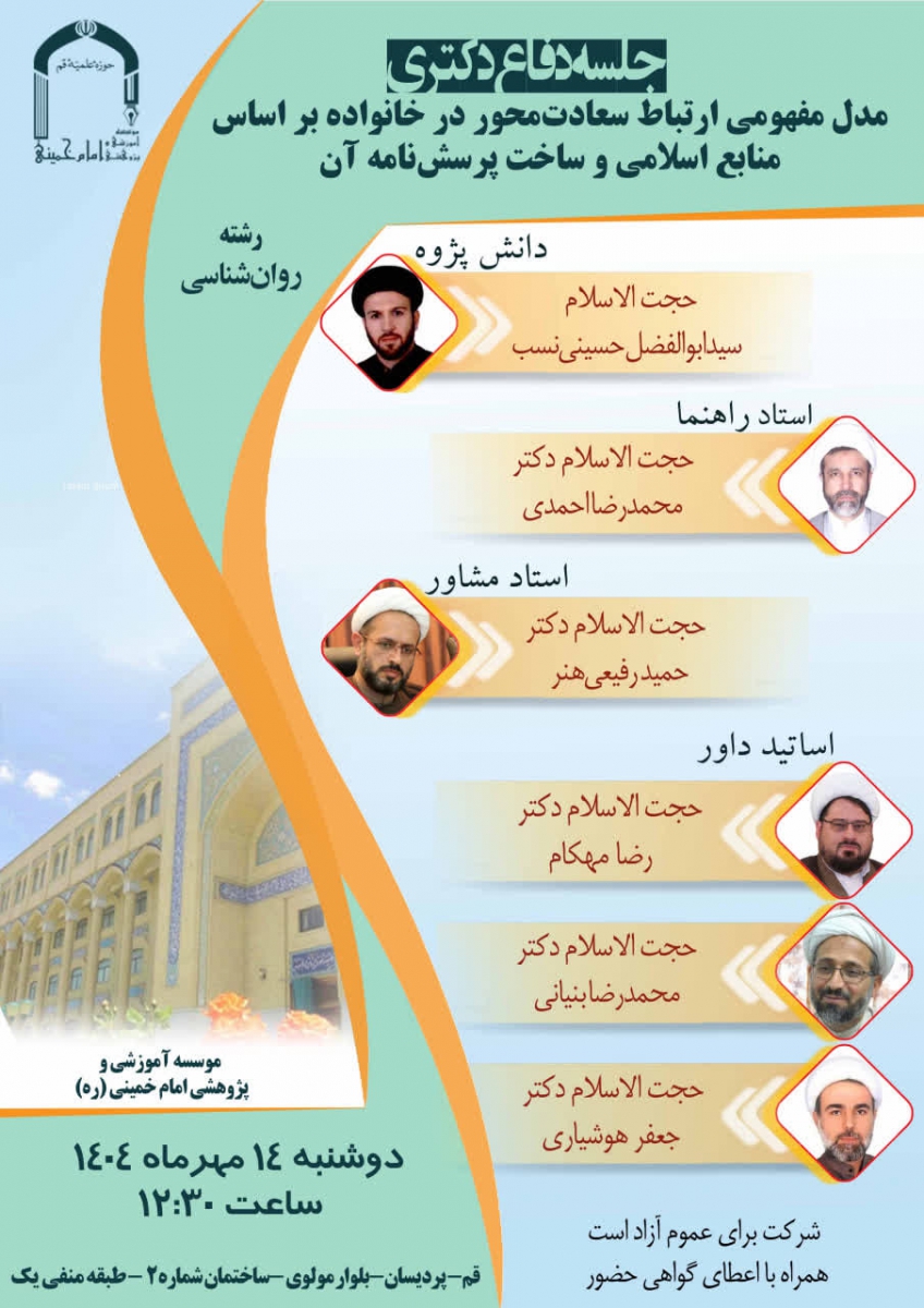 جلسه دفاع دکتری / رشته روانشناسی عنوان: « مدل مفهومی ارتباط سعادتمحور در خانواده بر اساس منابع اسلامی و ساخت پرسشنامه آن » دانش پژوه: حجتالاسلام سیدابوالفضل حسینی نسب استاد راهنما: حجتالاسلام دکتر محمدرضا احمدی استاد مشاور: حجتالاسلام دکتر حمید رفیعیهنر اساتید داور: حجتالاسلام دکتر رضا مهکام حجتالاسلام دکتر محمدرضا بنیانی حجتالاسلام دکتر جعفر هوشیاری دوشنبه ۱۴ مهرماه ۱۴۰۴ | ساعت ۱۲:۳۰ مکان: پرديسان - بلوار مولوی - ساختمان شماره ۲ مؤسسه آموزشی و پژوهشی امام خمينی (ره) - طبقه منفی یک، سالن جلسات دفاع شرکت برای عموم آزاد است. همراه با اعطای گواهی حضور |