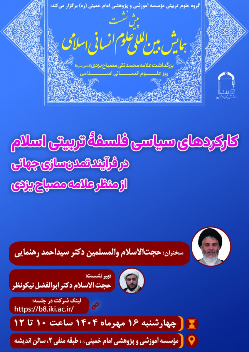 گروه علوم تربیتی مؤسسه آموزشی و پژوهشی امام خمینی ره برگزار میکند: پیشنشست همایش بینالمللی علوم انسانی اسلامی روز بزرگداشت علامه محمدتقی مصباح یزدی (قدس سره) | روز علوم انسانی اسلامی عنوان «کارکردهای سیاسی فلسفه تربیتی اسلام در فرآیند تمدنسازی جهانی از منظر علامه مصباحیزدی» سخنران حجتاسلام دکتر سیداحمد رهنمایی دبیر نشست حجتالاسلام دکتر ابوالفضل نیکونظر عضو هیئت علمی گروه عرفان مؤسسه آموزشی و پژوهشی امام خمینی ره لینک شرکت در جلسه چهارشنبه ۱۶ مهرماه ۱۴۰۴ | ساعت ۱۰ الی ۱۲ مؤسسه آموزشی و پژوهشی امام خمینی ره، طبقه منفی ۲، سالن اندیشه