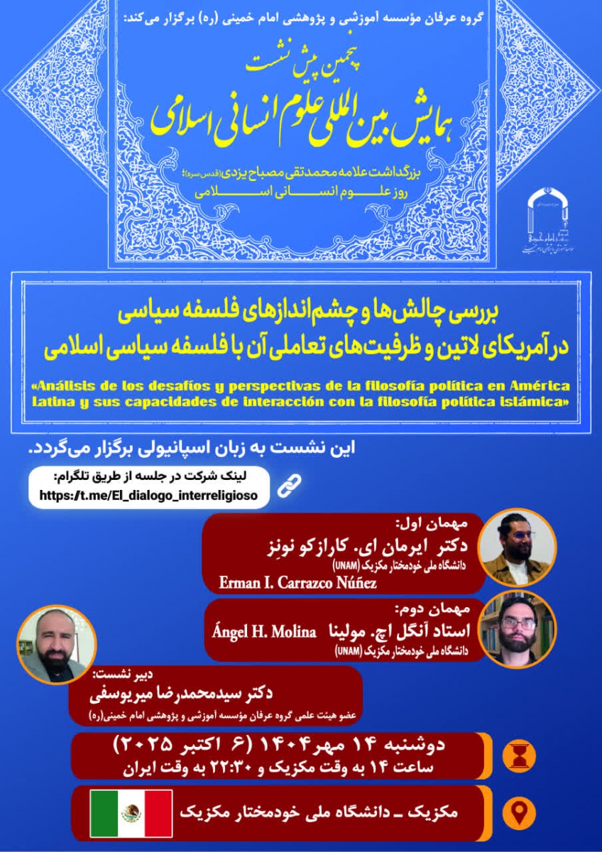 گروه عرفان مؤسسه آموزشی و پژوهشی امام خمینی ره برگزار میکند: پنجمین پیشنشست همایش بینالمللی علوم انسانی اسلامی روز بزرگداشت علامه محمدتقی مصباح یزدی (قدس سره) | روز علوم انسانی اسلامی عنوان «بررسی چالشها و چشماندازهای فلسفهسیاسی در آمریکای لاتین و ظرفیتهای تعاملی آن با فلسفه سیاسی اسلامی» Anallsis de los desafios y perspective de la filosofia politica en America latina y sus capacidaes de interaccion con la filosofia politica islamica