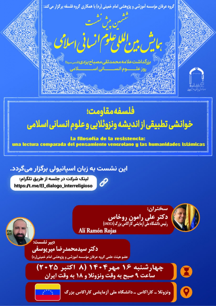 گروه عرفان مؤسسه آموزشی و پژوهشی امام خمینی ره برگزار میکند: ششمین پیشنشست همایش بینالمللی علوم انسانی اسلامی روز بزرگداشت علامه محمدتقی مصباح یزدی (قدس سره) | روز علوم انسانی اسلامی عنوان «فلسفه مقاومت؛ خوانشی تطبیقی از اندیشه ونزوئلایی و علوم انسانی اسلامی» La filosofia de la resistencia: una lectura comparada del pensamiento venezolano y las humanidades islamicas مهمان اول