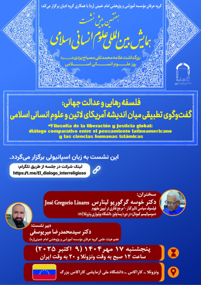 گروه عرفان مؤسسه آموزشی و پژوهشی امام خمینی ره برگزار میکند: هفتمین پیشنشست همایش بینالمللی علوم انسانی اسلامی روز بزرگداشت علامه محمدتقی مصباح یزدی (قدس سره) | روز علوم انسانی اسلامی عنوان «فلسفه رهایی و عدالت جهانی: گفت و گوی تطبیقی میان اندیشه آمریکای لاتین و علوم انسانی اسلامی» 'filosofia de la liberacion y justiciaglobal: dialogo comparativo entre el pensamiento latinoamericano y las ciencias humanas islamicas سخنران
